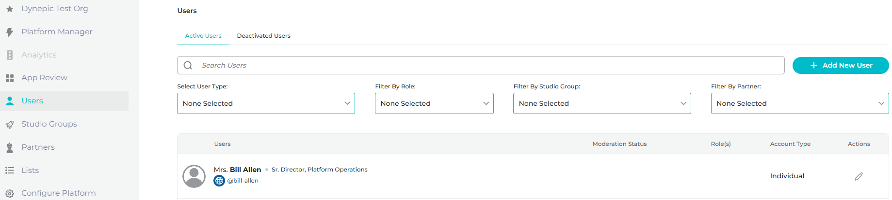 The user created is now visible on the active users tab.