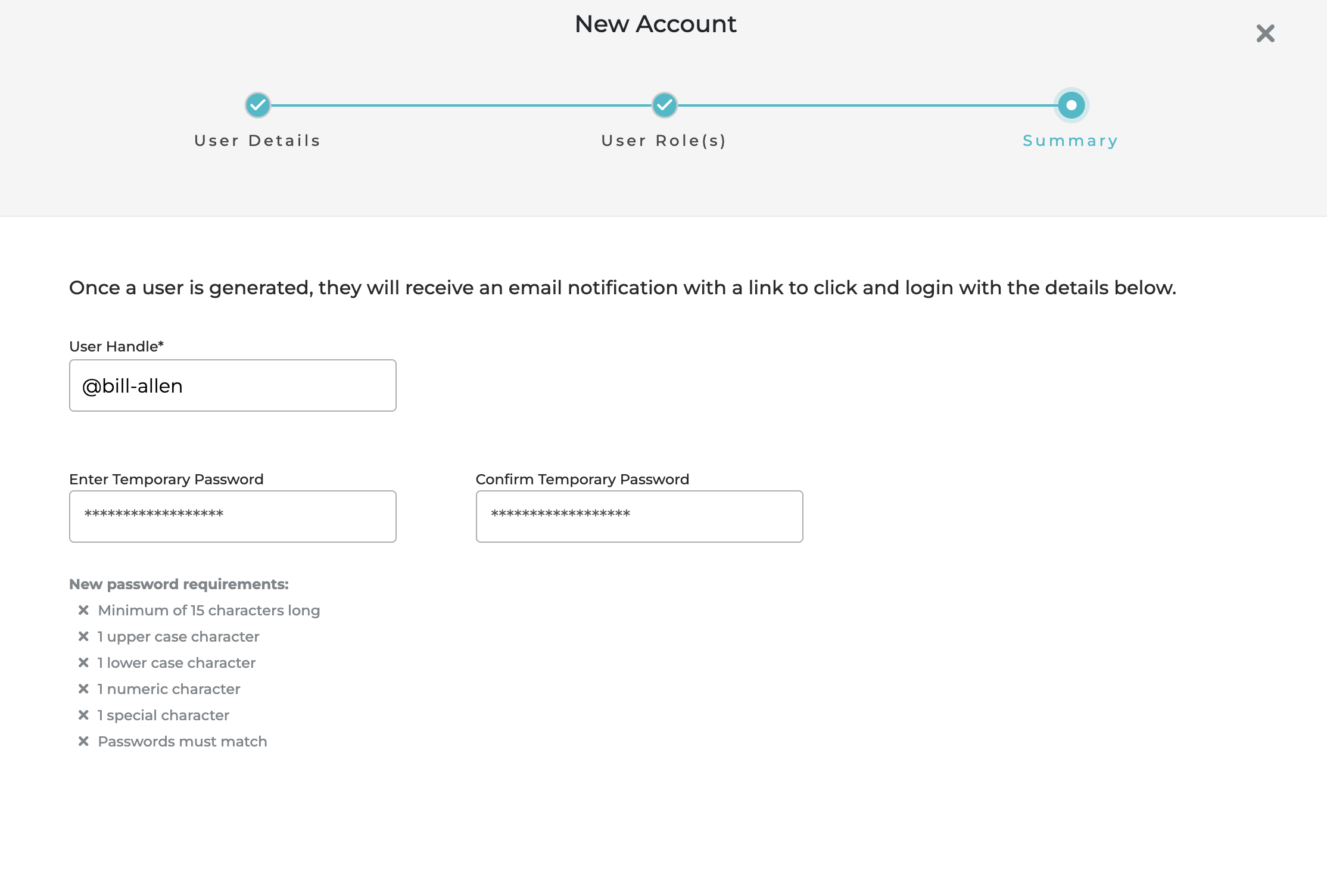Set the accounts temporary password within the summary view. After meeting the requirements **CLICK** create.<br>