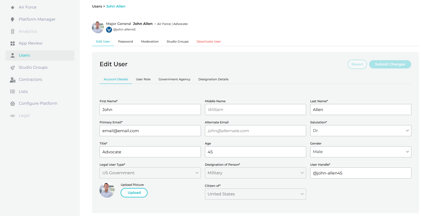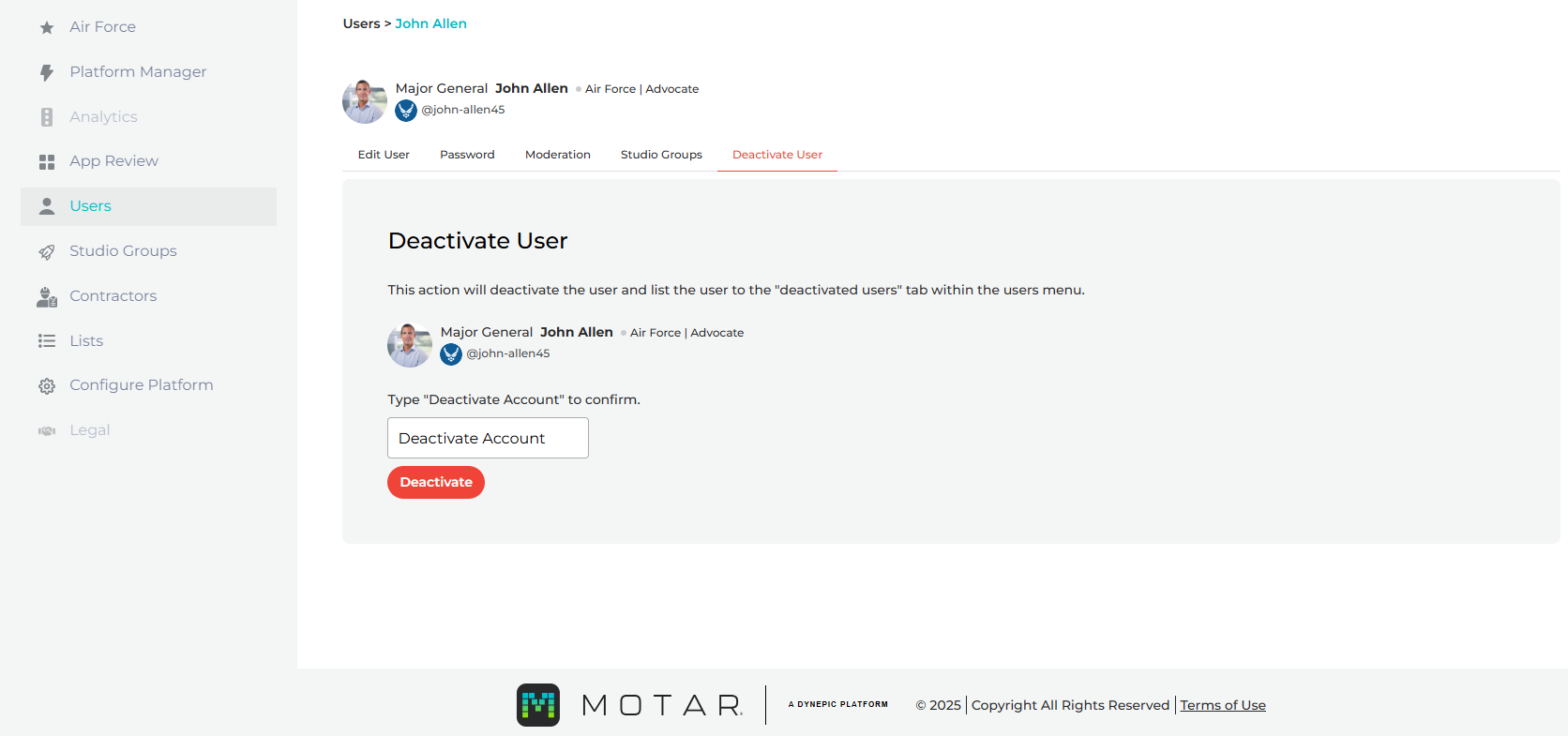 From the edit view tab, **CLICK** on the **DEACTIVE USER** tab. On this view the admin user can "deactivate" an "active" platform user. This action will deactivate the user and list the user to the "deactivated users" tab within the users menu.&#x20;