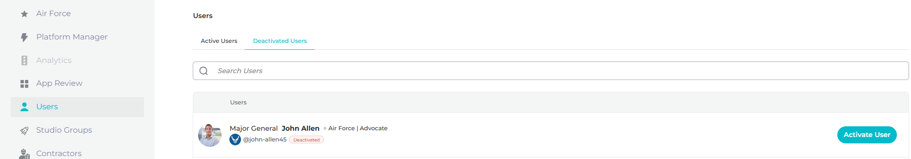 The deactivated users tab will display deactivated platform users. On this view the following is visible to the admin: